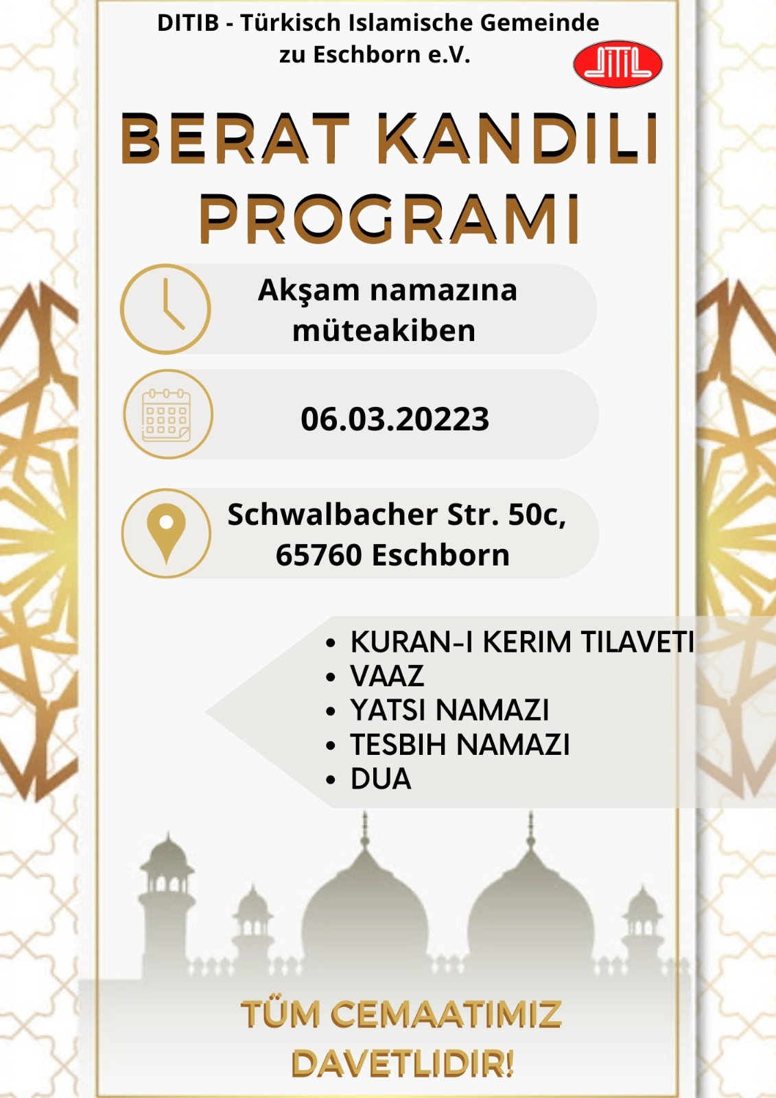 27.03.2022 Pazar günü saat 12:45‘de (öğle namazını müteakip) seçimli olağan genel kurulu gerçekteştirilecektir. Teşriflerinizi bekliyoruz.
